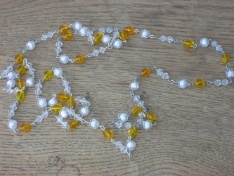 Ik hou wel van de combinatie wit/geel. Ik vond deze kunststoffen eigele kralen een erg mooie kleur hebben, maar ik stel vast dat een aantal van hen beginnen te verkleuren... :