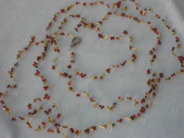 Mijn eerste en enige gehaakte ketting : ik had hem eerder op een dunnere nylondraad gemaakt en vond hem dan nog mooier, helaas brak de draad voortdurend... Ik heb er niet alleen rocaillees opgedaan, maar ook staafjes. Als je het zo haakt, wordt het erg elastisch en het is mooi om hem een paar keren rond je hals te draperen.