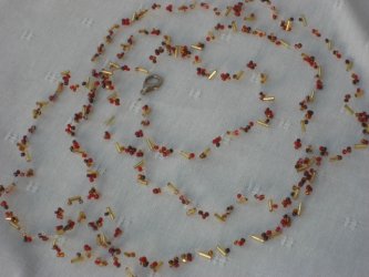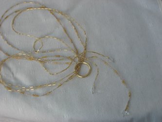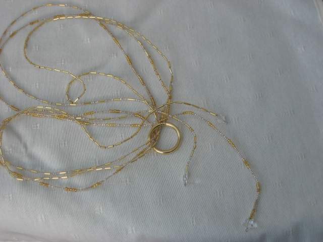 gouden lariat met ring : hij was helemaal in verschillende gouden kralen, maar er was 1 soort bij die haar kleur verloor... die zijn nu doorschijnend... :