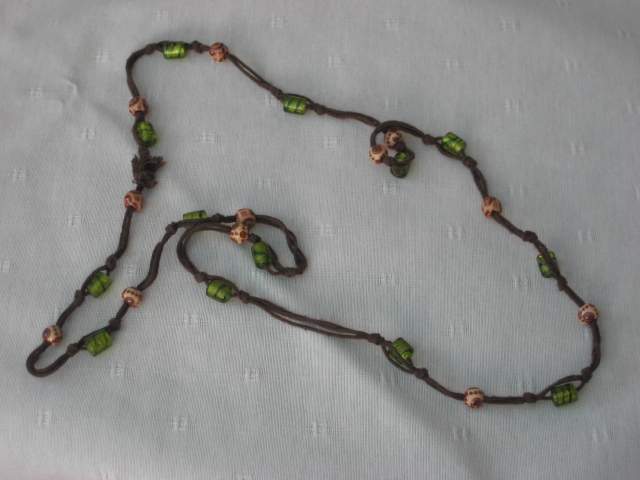 geknoopte ketting met groene zilverfoilkralen en houten kralen