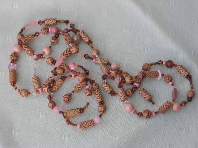 geregen ketting ( mijn eerste denk ik ) met alle mogelijke soorten rose kralen, gecombineerd met houten kralen