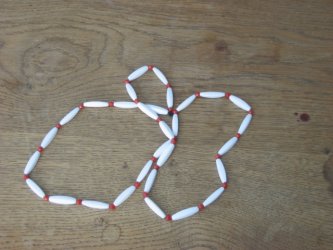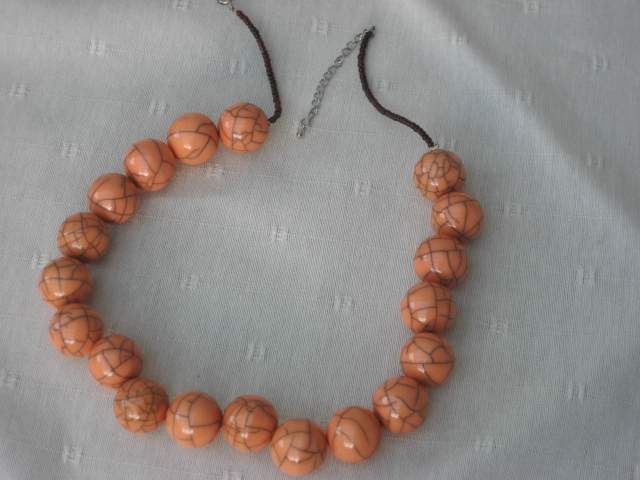 kettig met oranje bollen, helaas zitten de gaten niet helemaal in het midden waardoor de kralen niet mooi hangen. Ik wil er iets anders mee doen, maar weet nog niet wat ( suggesties zijn altijd wekom ! )