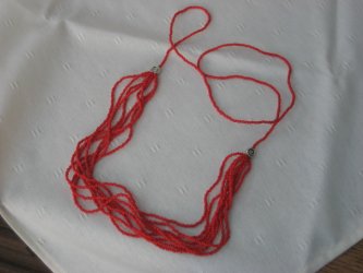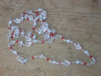 doorschijnend en rood gekettelde ketting, ik ben er niet wild van, ik denk dat het mooier was geweest met witte ipv doorschijnende kralen