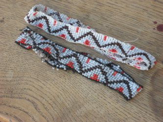 deze maakte ik al 10 jaar geleden : de een met zwarte randje maakte ik eerst maar die heb ik zo vaak gedragen dat ie begon te vervormen. ik heb hem dan maar zonder zwarte rand teruggemaakt, maar ik vond de eerste mooier. ik heb dit geweven met elastieken dwarsdraden.