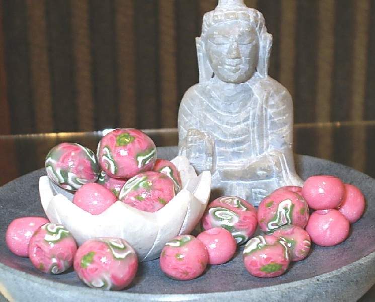 Deze roze fimokralen heb ik een groene 'frutsel' + 'n bloemachtig motiefje gegeven. Ik heb er ook een aantal effen kraaltjes bij gemaakt.