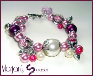 Roze/paarse bloemetjesarmband met glasparels en bloemenkralen.