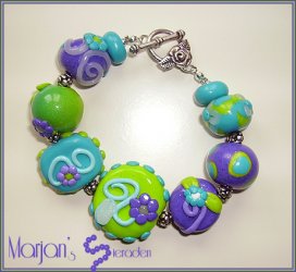 Paars/turquoise/limegroene armband met Fimo-kralen. De kleuren lijken op de foto minder mooi dan in 't echt.