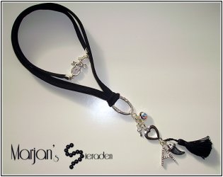 Simpele ketting met een brede suede veter en diverse hangers/bedels.