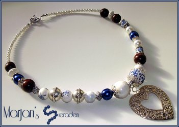 Set van ketting en armband met o.a. Delftsblauwe kralen, keramiek, metaal en hout.