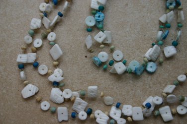 Een collega van mij had onderstaande (bestaande, geen eigen creatie) ketting en armband van een vriendin gekregen en wilde graag bijpassende oorbellen. Ik wilde ook in de oorbellen graag draad verwerken en denk dat ik redelijk in mijn poging geslaagd ben. Mijn collega was er in ieder geval erg blij mee.