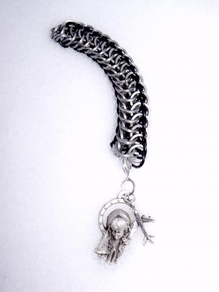Deze is voor mijn man, voor Sinterklaas. Hij vliegt in een ultrallight vandaar het vliegtuigje. de Maria is bedoeld als beschermheilige (komt van een erfenis, is de heilige maagd van Lourdes.) Een grapje eigenlijk want we zijn niet gelovig maar de vliegtuigbedel alleen leek te nietig bij de chainmaille ketting, vandaar