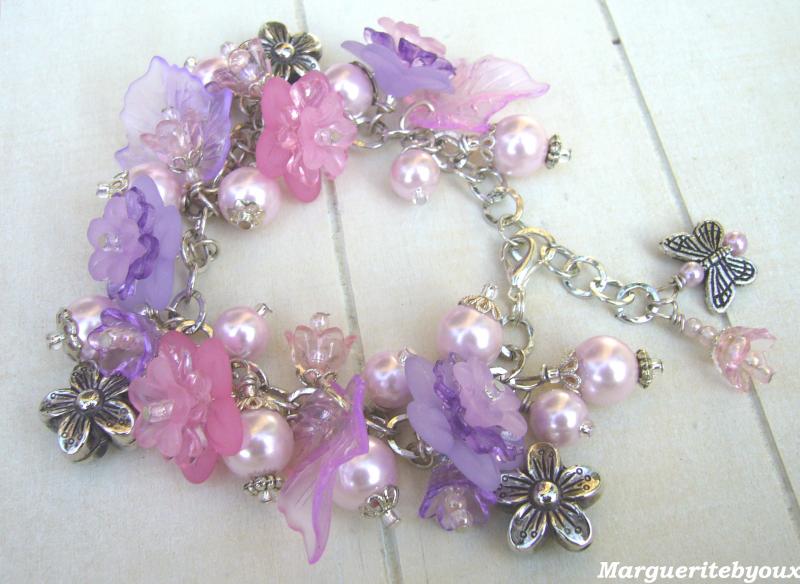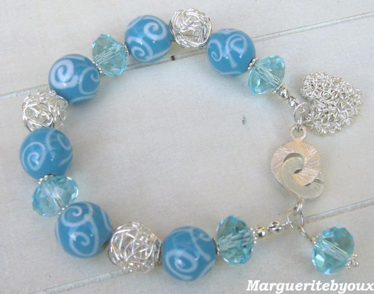 De eerste is een gewrapte bedelarmband in lente tinten en veel bloemen, de ander gewoon geregen, in mooi turquoise en zilverkleurige wire kralen.