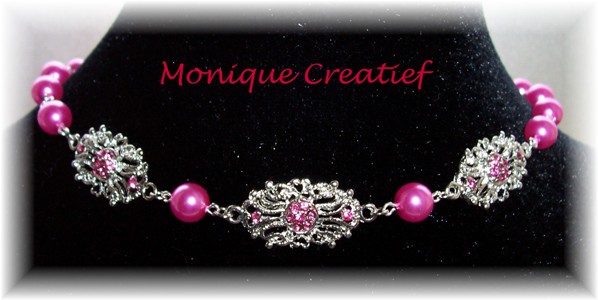 Zilverkleurige tussenstukken verwerkt met swarovski roze simillisteentjes en roze glasparels:
