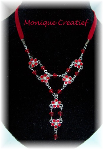 Zes tussenstukken verwerkt met swarovski rode en kristalAB simillisteentje verbonden door een rood kraaltje. Met suede band.