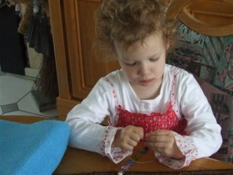 Hier zie je me bezig, je moet wel goed opletten want die gaatjes hebben ze superklein gemaakt. Volgens Oma mankeert er niets aan mijn fijne motoriek