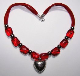 Ik heb een korte rode ketting gemaakt van suède veters, glaskralen en metalen kralen. Het hartje maakt het helemaal af. Wat vinden jullie ervan?