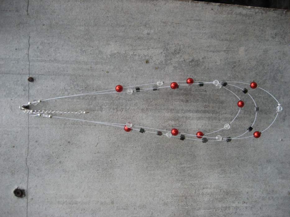 in rode glasparels, doorschijnende glaskralen en iets van halfedelsteen in zwart van armande, geregen op witte metaaldraad.