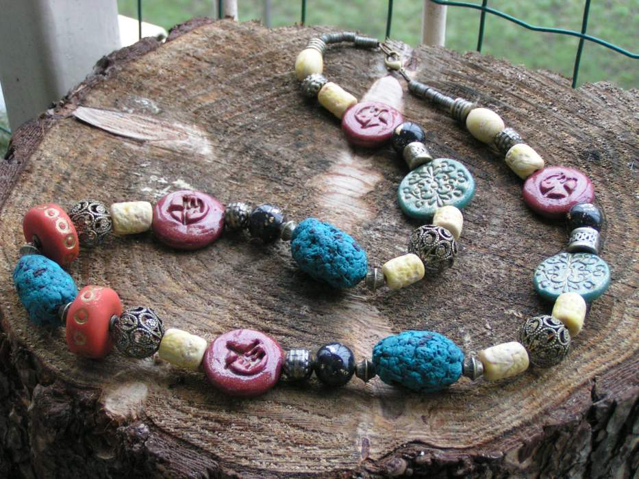 En een lange ketting met alemaal eigen gemaakte kralen, gecombineerd met bronzen tussenkralen, die zijn zelfgekocht, de rest is zoals gezegd Fimo.