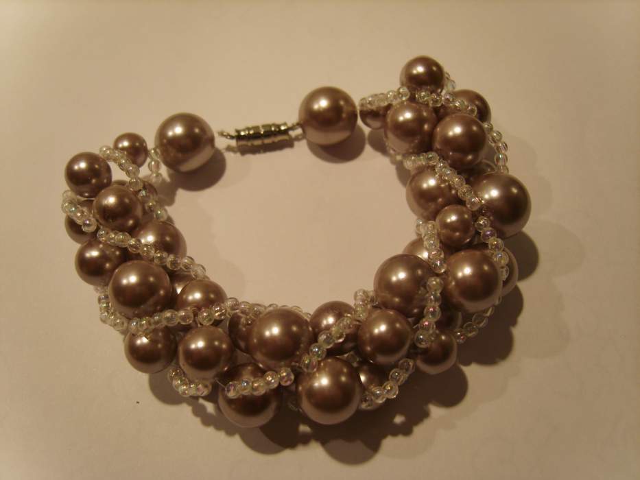 Brede parelarmband met doorzichtige glanskraaltjes en bruin/grijzige parels van verschillende groottes.